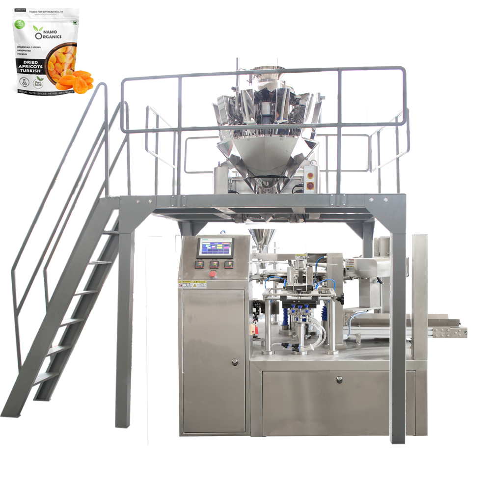 Rotary bag-given packing machine with different dosing (such as multihead weigher, auger filler, liquid filler etc.) can be suitable for the automatic packing for granular, powder, liquid, paste etc. Different kinds of product with the premade stand-up zipper pouch and so on.