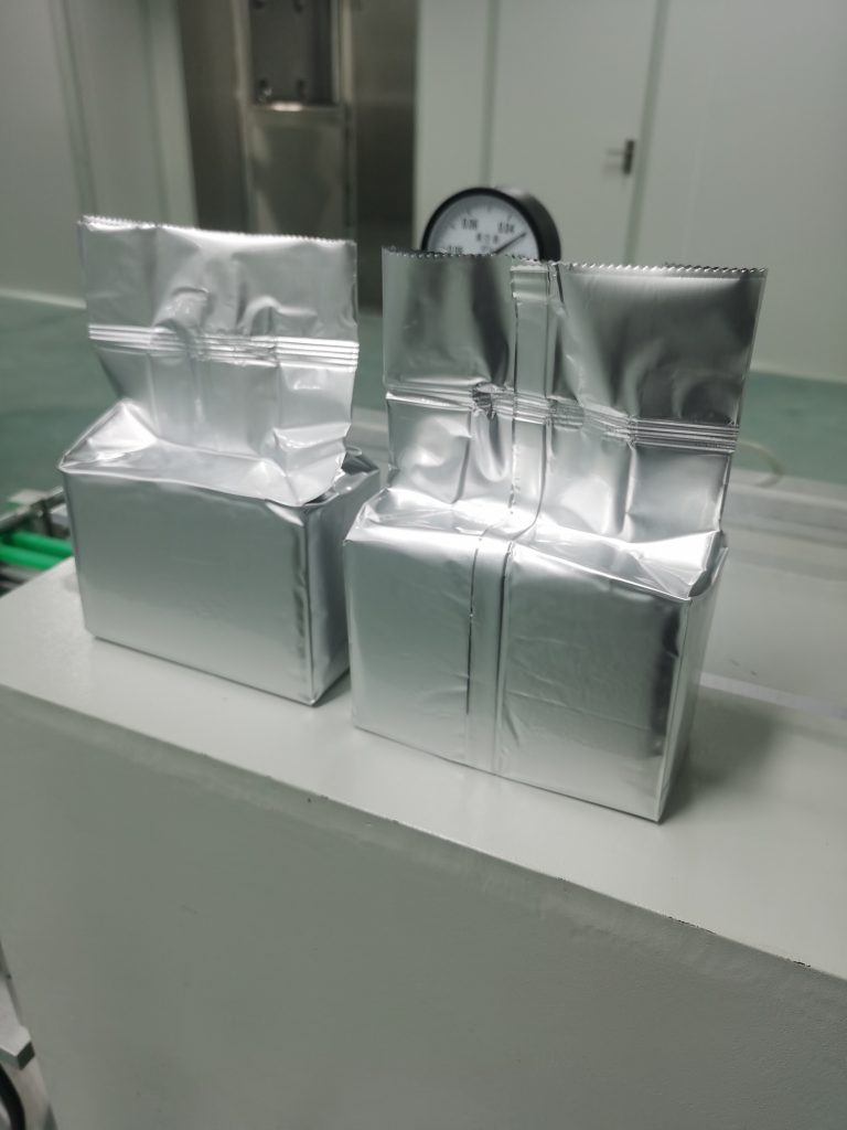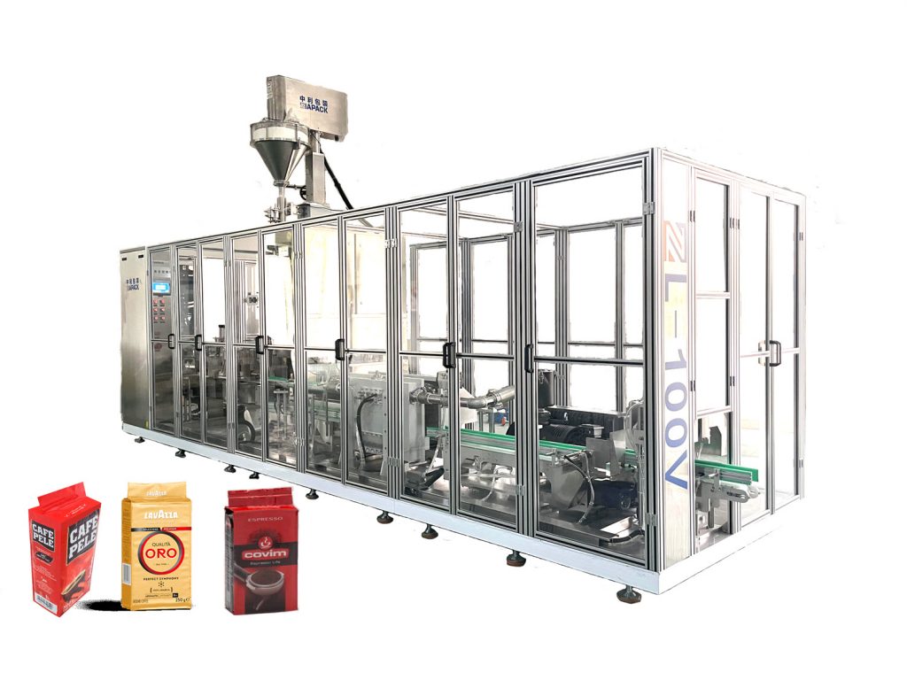 VFFS packing machine forming the bag by roller film -Weighing machine weighing and filling product .- Bag filling with product fall into bag carry module -Bag top forming and cleaning -Bag gusseted folding --Bag pre-sealing and vibrating --Bag send into vacuum chamber ---Vacuuming and final sealing --Finished bag output and triming the bag top ---Finished bag output